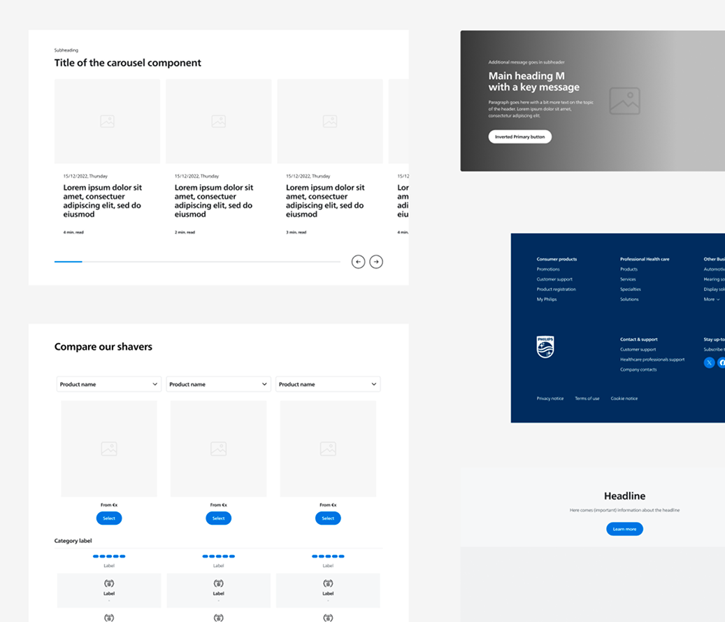 A scalable, unified design system adopted across multiple Philips business units. Reduced design inconsistencies, accelerated product team workflows, and established a single source of truth for UI decisions. Page templates enabled faster project kickoffs while maintaining brand coherence at scale.